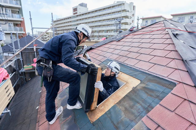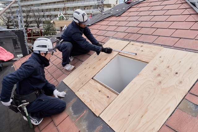 天窓を撤去した部分は、下地の調整後、防水シートを施工し、新しい屋根材で仕上げます。雨漏りに十分気を付けて作業を行います。