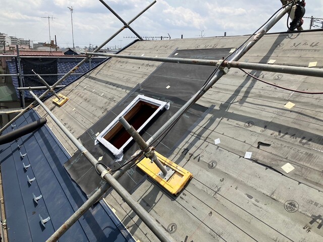 天窓を撤去した後、防水シートをしっかりと取り付けてから、新しい屋根材を設置しています。