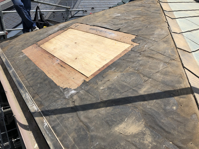 天窓と板金を取り外した部分は屋根材と同じ高さになるようにし、防水シートと新しい屋根材を設置します。