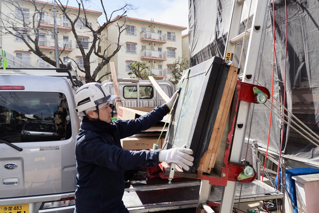 窓枠はそのまま残し、同じサイズのガラスと交換する作業です。